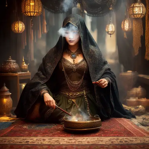 over 2 years ago (HDR, ((8k)), epic, digital painting, hyperrealistic, cinematic lighting, Trending on artstation, anthropomorphic, dragon, portrait, creature, detailed clothing, detailed eyes, 8k, fine details, sharp focus, modern, post-apocalyptic) mysterious fortune teller: A figure sits cross-legged on a woven rug in a dim corner of the ancient marketplace tent, their face obscured by a veil of swirling incense smoke. Customers approach with trepidation, drawn by the promise of exotic predictions that often come true. Verinax 2 95