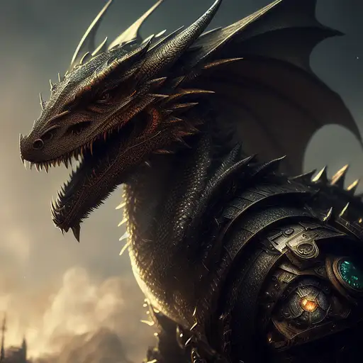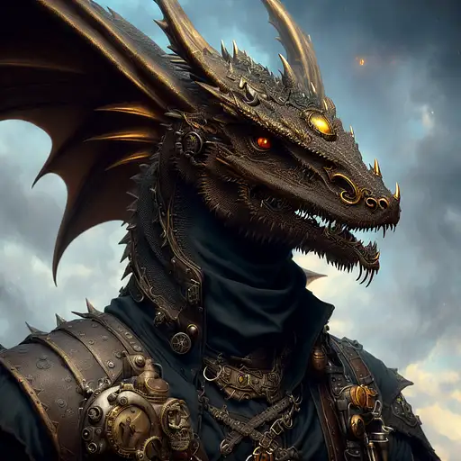 over 2 years ago (fantasy, epic, digital, painting, hyperrealistic, artstation, portrait, anthropomorphic, steampunk, industrial, old western) A male (dragon:1.2) with dark, (black scales:1.0) Verinax 1 85