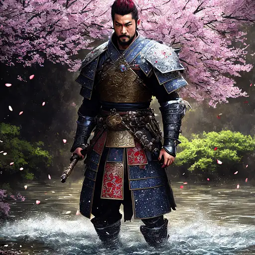 over 2 years ago a male samurai in oriental plate armor (intricately detailed metal) walking through a river, water splashing, mist, multicolored pebbles, godrays through trees, dnd character, falling cherry tree petals, 8k, masterpiece, hyperrealistic, depth of field, full body portrait, full body, solo, realistic Verinax 3 300