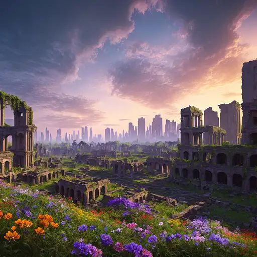 over 2 years ago vast (ruins of a city once bustling city), (overgrown with a vibrant array of flowers), 8k, cinematic lighting, night, HDR, <lora:epiNoiseoffset_v2:1> Verinax 2 110