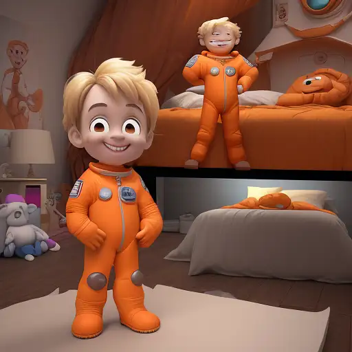 almost 2 years ago sheets of poses and expressions in a 3d pixar cartoon style of (a medium blonde hair little boy with brown eyes and smiling wearing a orange space suit), tim burton thriller movie still, pixar cartoon character surrounded by his room in a special universe ambience, spectacular, spectacle, forced perspective, feminist art, empowering, masterpiece, 3d render, cracked clay, colorful, oversaturated, depth Vicbolt 0 82