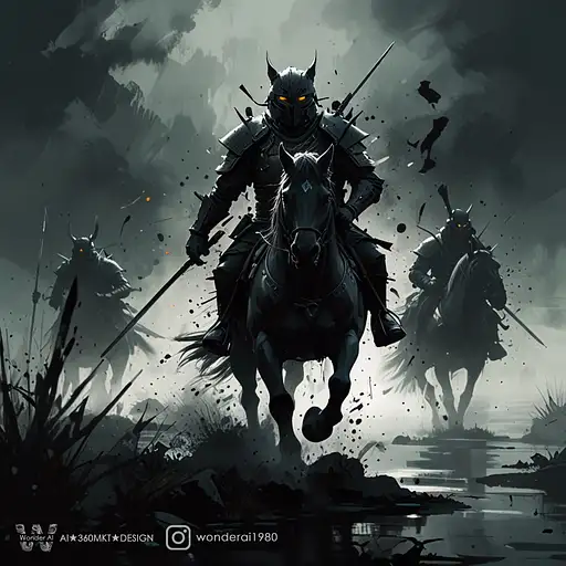 1 year ago watercolor art by Benedick Bana, motion view, real anthropomorphic cat wearing fantasy samurai armor, riding horse, charging forward, detailed face, struggling to cross a misty swamp in the middle of a battlefield with multiple armies, swampy, foggy, cloudy, wearing a coat embroidered with the family crest, lots of samurai fighting in the background, masterpiece, hyper detailed, best quality, high quality, 16K, dramatic lighting, shadowy, raytrace, black tone WonderAI1980 1 40