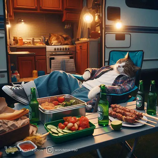1 year ago Visually striking and dramatic scene, anthropomorphized real cats wearing casual style clothing, lazy and comfortable sleepy expression lying on camping chairs, camping caravan at the side, (drink Heineken, meal box, fruit, BBQ kebabs, camping lamps) hyper details, 8K, film still WonderAI1980 3 100