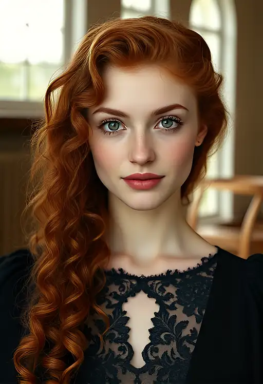 11 months ago A young woman with long, curly red hair and fair skin featuring natural freckles across her cheeks. Her eyes are bright green with almond-shaped lids, her lips are full and painted a soft pink, and she has a Roman nose with a distinctive curve in the bridge. She is wearing an elegant black dress with intricate lace details around the neckline. The setting is an indoor room with large windows allowing soft natural light to stream through behind her. The atmosphere is serene and peaceful. In the style of realistic portraiture similar to the work of Rembrandt. The composition centers her face with balanced framing, evoking a sense of calmness and beauty XGODZ 0 36