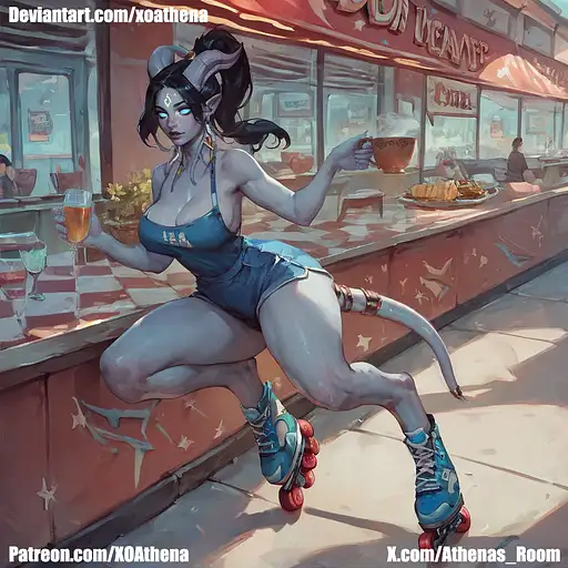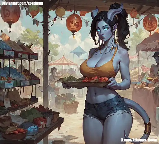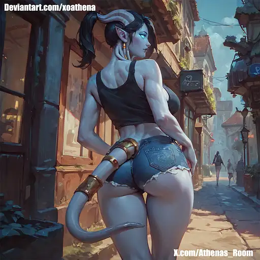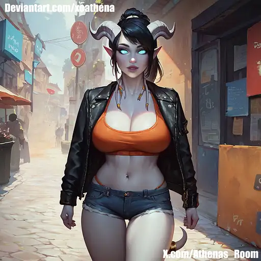 1girl, draenei, ponytail, (white skin:1.3), black hair, semi-realistic, front view, far view, (Short shorts), ((denim shorts) ), sexy pose, yellow sexy blouse, big breasts, blue glow eyes, bar background