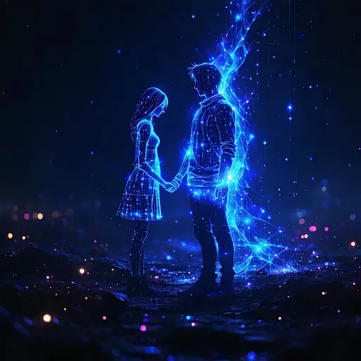 A chaotic, surreal, and illogical scene inspired by Pink Floyd's '70s album art. At the core of the desolate, moon-like landscape, two intertwined figures emerge from a glowing rift. One side is a serene, human face in profile, gazing intently forward, while the other side is a fragmented, crystalline, and glowing counterpart, shimmering with internal light and collapsing into geometric shards. This dual entity is centrally positioned, replacing the walking corporate man, symbolizing the internal conflict between humanity and technological deconstruction. In the mid-ground, a dilapidated, ancient house stands tall, with a single, high window glowing eerily, revealing a silhouetted man before a flickering television. In the background, a lone, distorted school desk is engulfed in flames, while a flock of flying, mechanical sheep with glowing red eyes drifts aimlessly through the sky. The entire scene is bathed in a dramatic, high-contrast light, casting long, unsettling shadows. The color palette is dominated by stark contrasts of deep blues, fiery oranges, and muted grays, with vibrant electric blues and golden glows emanating from the fragmented figure, adding a futuristic yet melancholic touch. A gritty, film-grain texture permeates the image. A lone, glowing prism, reminiscent of The Dark Side of the Moon, shatters light into a chaotic rainbow that illuminates only the most absurd elements of the image. The atmosphere is melancholic, dystopian, and full of a sense of longing and alienation, exploring themes of identity loss and fractured reality.