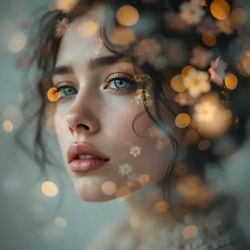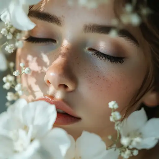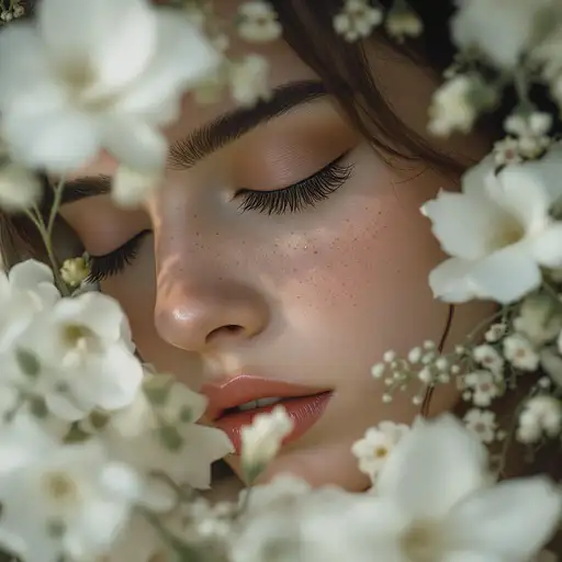 5 months ago a dreamy, emotional close-up portrait of a young woman with soft freckles, long eyelashes, and gently closed eyes, surrounded by delicate white flowers and foliage, her face partially hidden behind petals, natural soft lighting, shallow depth of field, high detail on skin texture and floral elements, melancholic and romantic mood, cinematic atmosphere, floral shadows cast across her skin, poetic and intimate composition, inspired by fine art photography, ethereal and tender --ar 1:1 --v 6 --style raw --style photographic ZeroTrace PRO 0 14