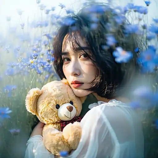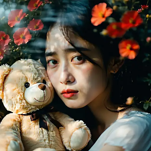 5 months ago double exposure portrait, frontal view melancholy woman, translucent teddy bear hugging her shoulder, dreamy bokeh flowers forming a circular frame, soft matte color grade, slight vignetting, clear empty band of negative space at top and bottom for titles, --ar 1:1 --v 6 --stylize 150 ZeroTrace PRO 0 10