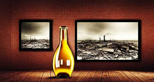 over 2 years ago realistic art photograph; 4K, real engine, octane render --ar 9:16; atomic bomb explosion in a glass bottle, reflections on wooden table; In the background a wall-sized photo of a destroyed city from World War II a47ce9a6569 0 56