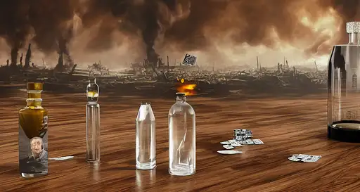 over 2 years ago realistic art photograph; 4K, real engine, octane render --ar 9:16; Two men are seated at a round table; in front of each man stands a shot glass; A transparent vodka bottle stands in the middle of the table; reflections on wooden table; In the background a wall-sized photo of destroyed city from World War II a47ce9a6569 0 84