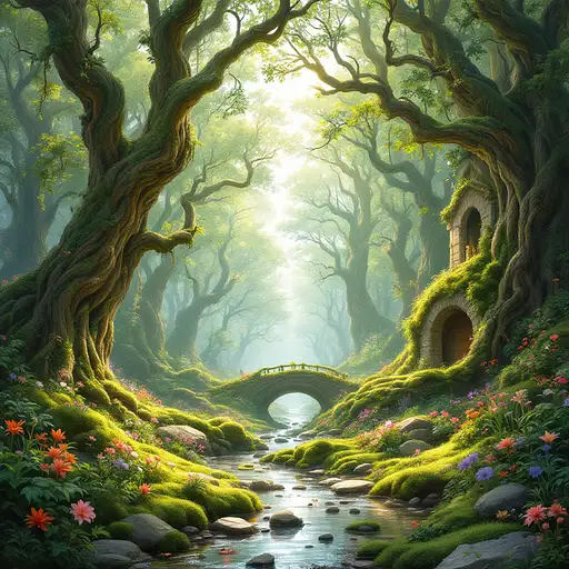 7 months ago A magical forest alive with wonder, where colossal trees with winding branches exude an otherworldly glow. The soft moss-draped ground hosts tranquil streams, vibrant flowers, and age-old ruins, sheltering an unseen fairy community. a4faa181882 0 25