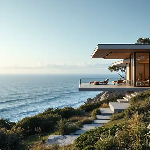 10 months ago Hyper realistic eye level exterior photo of a mid century modern style house overlooking the ocean, daylight, indirect lighting, AD magazine, Frank Lloyd, Eames, Mies van der Rohe aa5797ceb8a 0 33