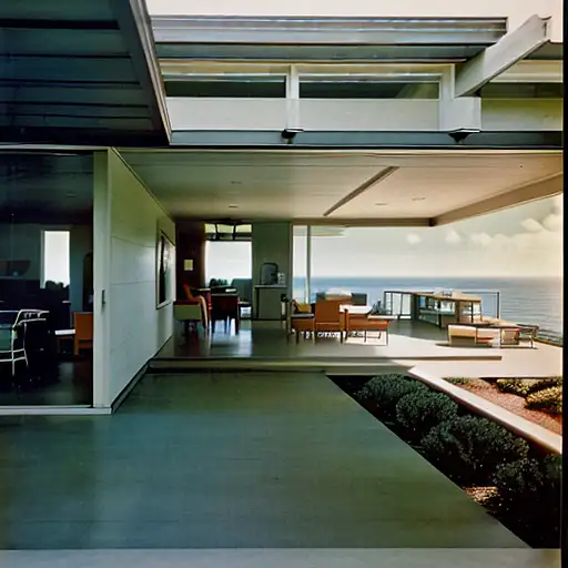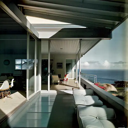 1 year ago Hyper realistic eye level exterior photo of a mid century modern style house overlooking the ocean, daylight, indirect lighting, AD magazine, Frank Lloyd, Eames, Mies van der Rohe adfd25030e0 0 37