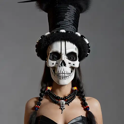 1 year ago Stylized witch doctor with skull face, black lines on face, costume adorned with beads and highly rendered jewelry, top hat headdress, upper torso adfd25030e0 0 55
