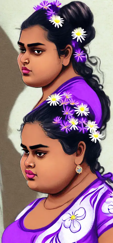 1 year ago A head to knee side view photo of a plus-size, thick, chubby fat Sri Lankan woman of 26-year-old with dark brown skin. She has a top knot hair bun. She is wearing a sleeveless, strap-tied, ruffled top of purple colour with many designs of many small white daisy flower designs on it. She is also wearing a white, high-knee socks on both legs. She is also wearing a low-waist bikini bottom piece of pink colour with many small designs of many small white daisy flower designs. Her bikini bottom piece has waistline frills of white colour. She is standing in a side view with her hands down in a white background. ae0f6b016f7 0 34