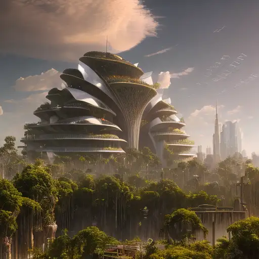 almost 3 years ago A cinematic composition depicting : we're overlooking a cyberpunk civilization with overgrown buildings by santiago calatrava, where a solarpunk tribe is peacefully collaborating with their android helpers, octane render, hyperrealistic, at sunrise, by edward hopper aebb6f26962 0 150