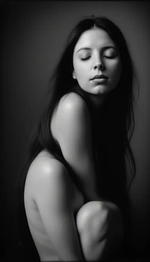 2 years ago 4K image, Black and White, sharp catch lights in eyes, A soul-stirring portrait of a woman, eyes closed, head tilted slightly downwards, long dark hair, rim lighting, her grace enhanced by the soft gradient of natural light, the chiaroscuro effect adding depth, taken by the esteemed photographer Sally Mann, Photography, Hasselblad X1D II with an 80mm f/1.9 lens, set at f/2.8, ISO 64, 1/180s, with ambient light sculpted using a large diffuser and a large diffuser, --ar 9:16 --s 200 afee266926c 0 68