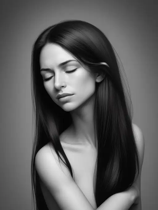 2 years ago 8K, Black and White photo, A stirring portrait of a beautiful woman, eyes closed, head tilted slightly downwards, long straight dark hair, taken by the famous American photographer Annie Leibovitz , Hasselblad X1D II with an 80mm f/1. 9 lens, set at f/2. 8, ISO 64, 1/180s, afee266926c 0 65
