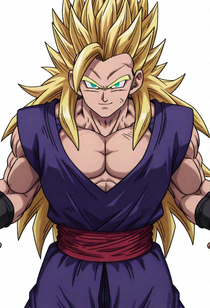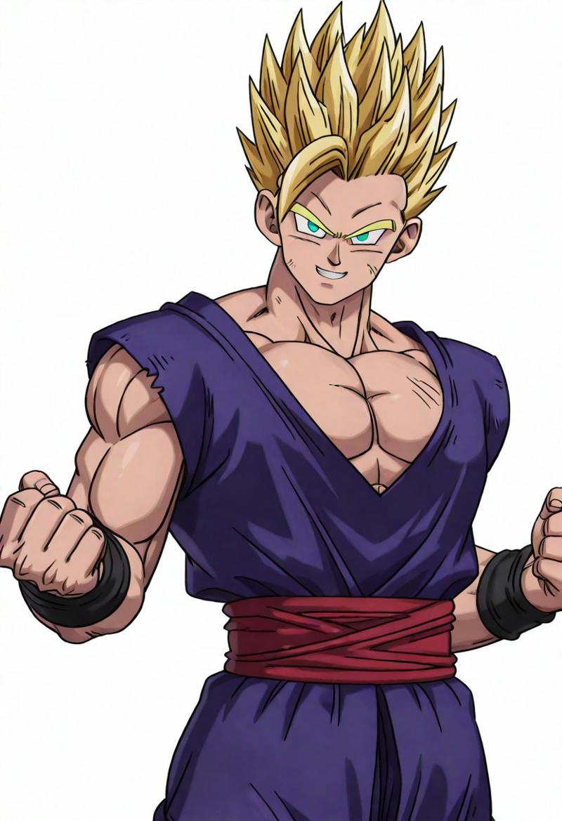 DBSSHSSGohan, 1boy, spiked hair, yellow hair, super saiyan, blue eyes, purple dougi, red sash, black wristbands, purple pants, olive-brown shoes, muscular male,