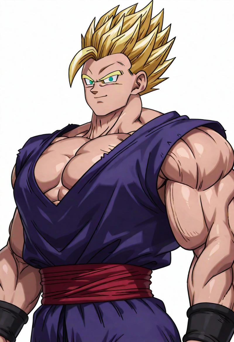 DBSSHSSGohan, 1boy, spiked hair, yellow hair, super saiyan, blue eyes, purple dougi, red sash, black wristbands, purple pants, olive-brown shoes, muscular male, muscular, massive muscles, very muscular, bulky muscles, huge muscles, thick muscles, thick arms, big shoulders, big biceps,
