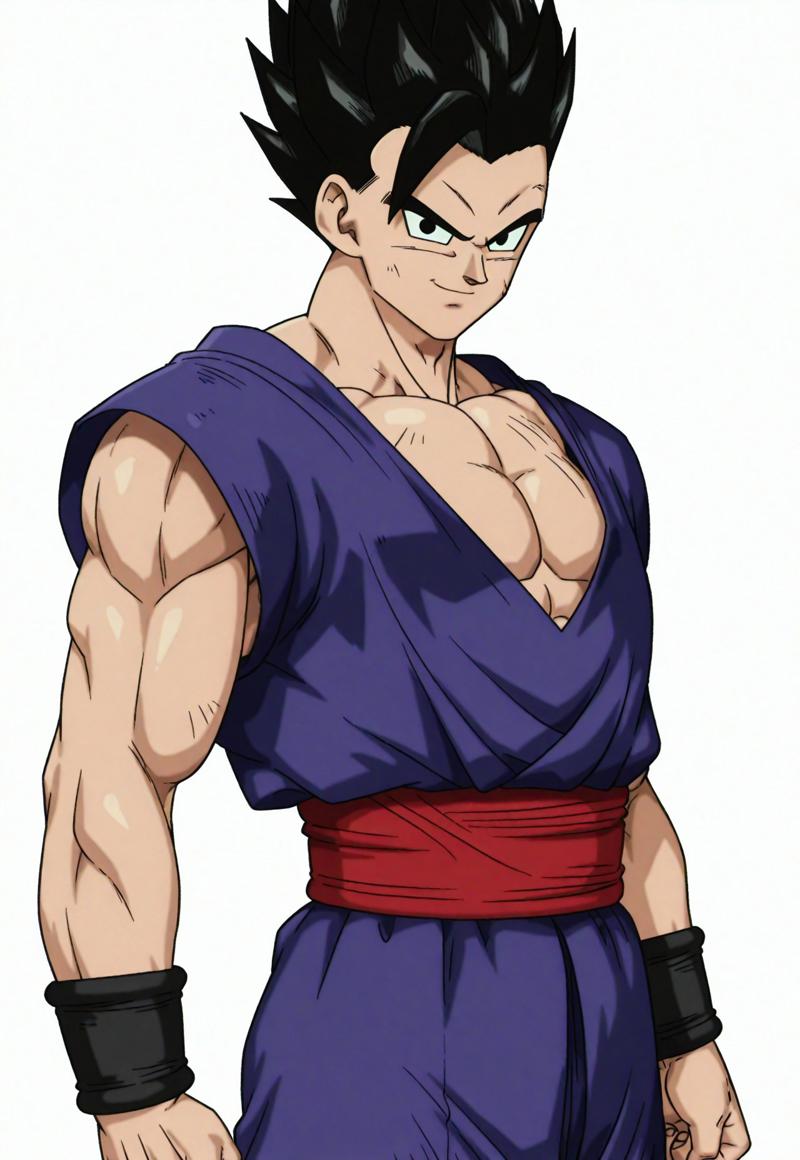 DBSSHUGohan, 1boy, spiked hair, black hair, black eyes, purple dougi, red sash, black wristbands, purple pants, olive-brown shoes, muscular male,