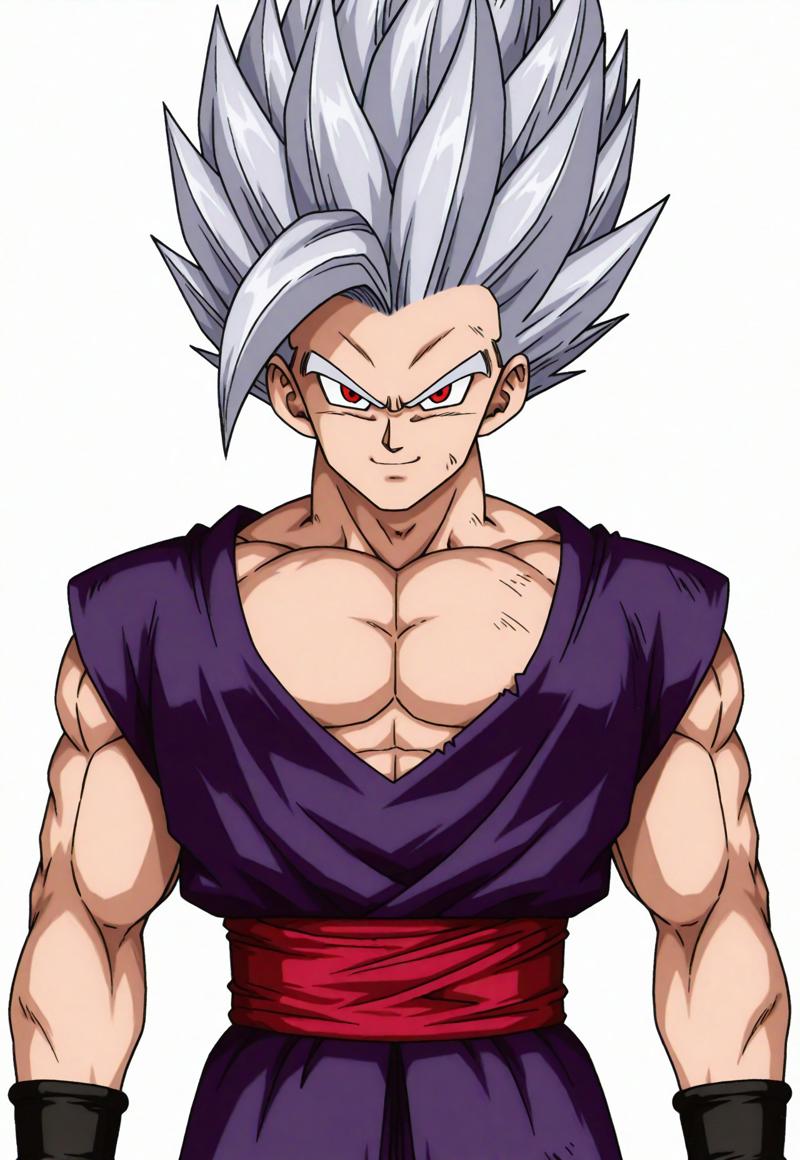 DBSSHBTGohan, 1boy, spiked hair, light grey hair, red eyes, purple dougi, red sash, black wristbands, purple pants, olive-brown shoes, muscular male,