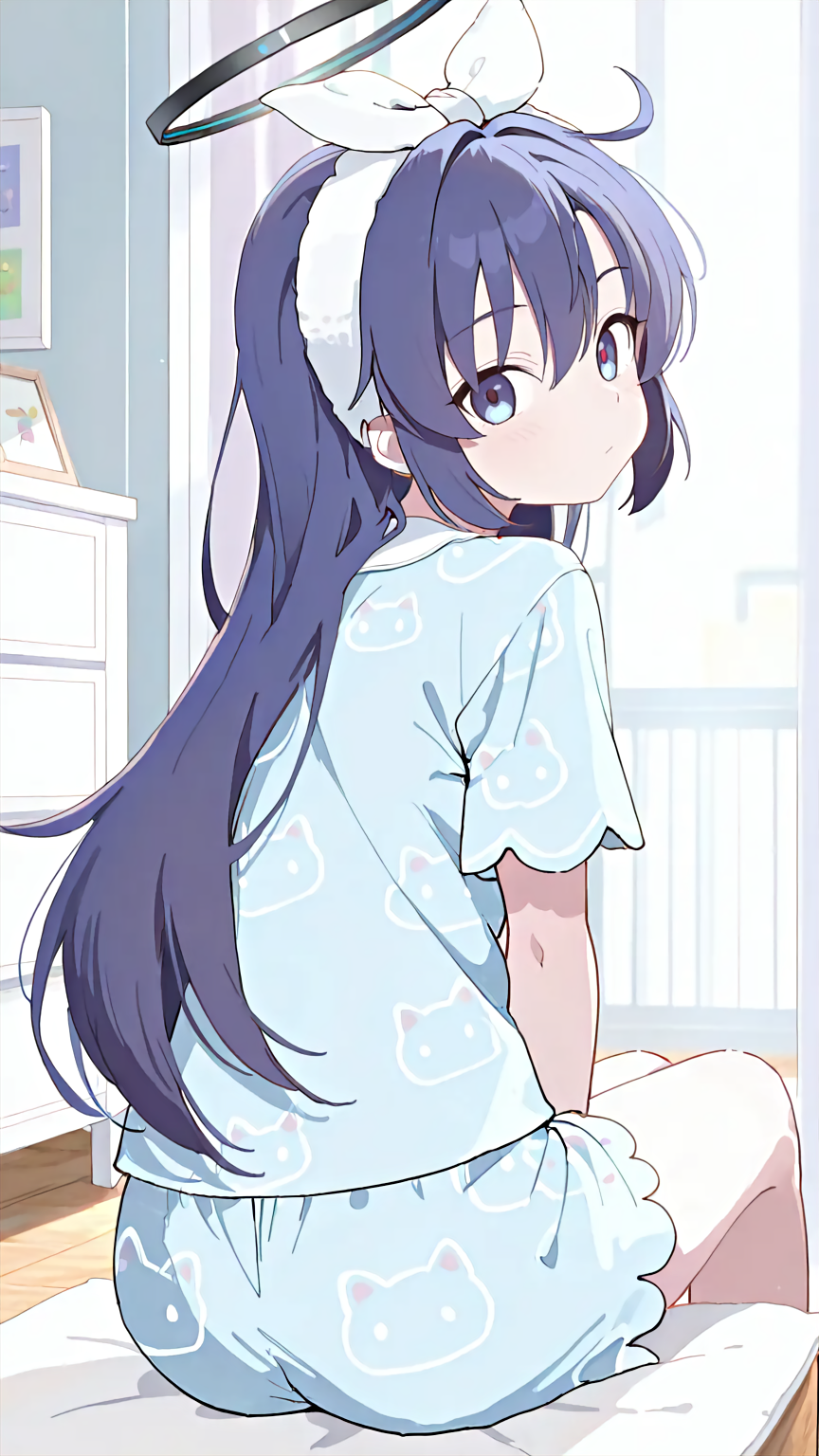 yuuka-pajamas,yuuka \(blue archive\),blue eyes,blue hair,long hair,halo,headband,blue pajamas,print clothes,short shorts,slippers