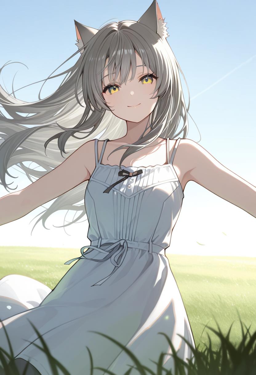 "MI0XC3, grey hair, short hair, cat ears, white tanktop, chest jewel, open jacket, off shoulder, frilled skirt, pantyhose, fingerless gloves"