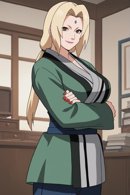 <lora:Tsunade-IL-v1-07:0.7>, ChopioTsunade, blonde hair, long hair, low twintails, hair tie, brown eyes, forehead mark, pink lipstick, looking at viewer,