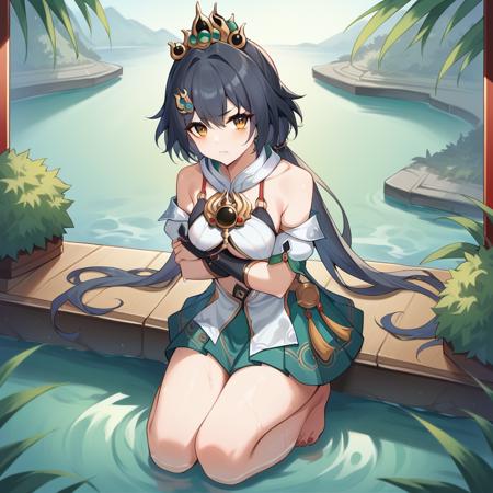Yunli, black hair, orange eyes, low twintails, long hair, hair ornament, tiara,Optional: Add "red nail polish" to the Prompt if you well want her to have red nails.