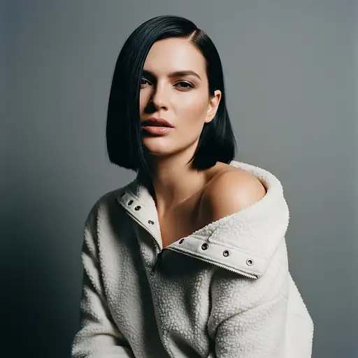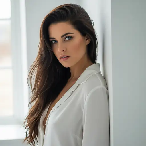 4 days ago Portrait of a beautiful young woman with long, dark brown hair and intense blue eyes, wearing a loose, unbuttoned white silk shirt. She is leaning against a clean, minimalist white wall corner. Soft, natural window light from the side, high key lighting, shallow depth of field. Intimate, inviting, and highly detailed portrait photography. Canon 5D Mark IV, 85mm lens. aivisionspace 0 14