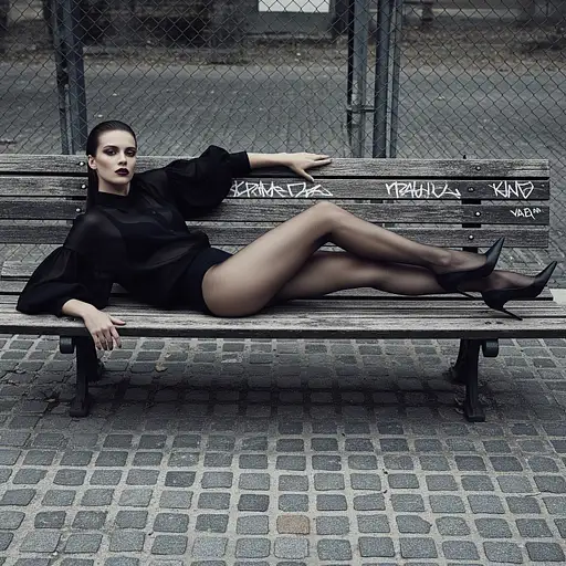 2 days ago High-fashion editorial photograph, dramatic lighting, featuring a female model in an elegant, severe pose on a weathered park bench. The model is wearing an all-black outfit: a sheer black blouse with voluminous sleeves and opaque black sheer tights/pantyhose, finished with black pointed-toe stiletto heels. The pose is horizontal and angular, with legs dramatically extended. Dramatic, dark makeup with deep burgundy lipstick. The setting is a stark, urban environment: a grey stone/cobblestone ground and a harsh chain-link fence/mesh backdrop. Cold, desaturated color palette of blacks, greys, and muted natural tones. Shot with a high-end camera, high contrast, cinematic, Vogue aesthetic, full-body shot. aivisionspace 0 7