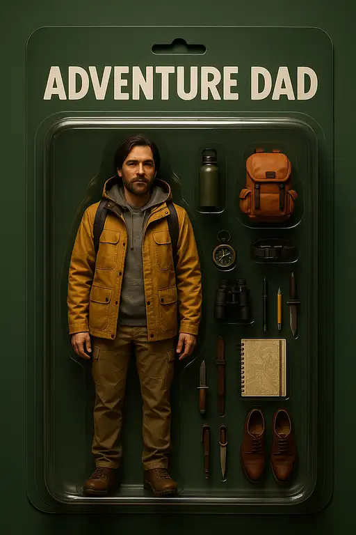 3 months ago A hyper-real cinematic shot of a life-sized “Adventure Dad” action figure still inside its clear plastic toy packaging, displayed against a matte forest-green background with bold white letters “ADVENTURE DAD” at the top. The dad has medium-length dark hair and a neat beard, wearing a mustard-yellow outdoor jacket over a gray hoodie, khaki hiking pants, and rugged brown boots with red laces. Surrounding him inside the packaging are meticulously arranged adventure accessories: a small orange backpack, a green metal water bottle, a pair of black binoculars, a compass, a belt, a dagger, a pen, a pencil, a spiral-bound topographic map notebook, and a pair of brown dress shoes, all lit with soft diffused cinematic lighting. The scene has a warm, Wes Anderson-inspired color palette with precise symmetrical framing, showcasing the humor and charm of an “outdoor dad ready for any adventure,” with realistic materials, crisp textures, and subtle shadows, creating a playful yet aspirational toy aesthetic in hyperreal style. aivisionspace 0 39