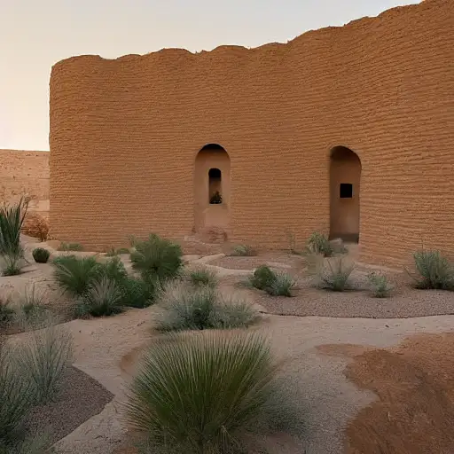 over 2 years ago Hyper realistic eye level exterior photo of a Berber Grain Storage house, inspired by natural carvings found in the landscape an oasis with terraces, courtyards, and caves enclosed within a sinuous outer wall, desert hideaway, overlooking the desert, daylight, Saudi Arabia, indirect lighting, AD magazine, Christophe Benichou, Mies van der Rohe alikaysmontreal 0 110