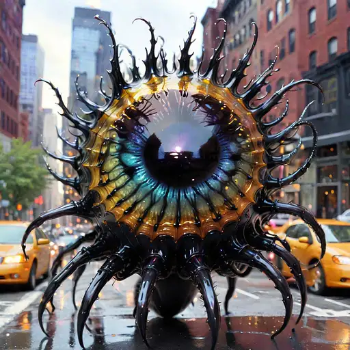 almost 2 years ago ferrofluid monster mixed between a spider and a wasp::5 on a new york street, tentacles, eyes on stalks, detailed iridescent, metallic, translucent, dramatic lighting, hyper futuristic, digital art allbad 1 130