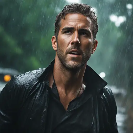 almost 2 years ago highest quality action photo in the rain, lean man (ryan reynolds:george clooney:0. 4), wet black t-shirt, wet hair, skin pores, face, eyes heterochromia, rich deep colours, , jungle, The scene is shot with (Kodachrome) (filmgrain:1. 1) (Analogcamera:1. 1) (Sharpdetails:1. 1) (50mm:1. 1) (carlzeiss:1. 1) (planar@f4:1. 1), bokeh allbad 1 45