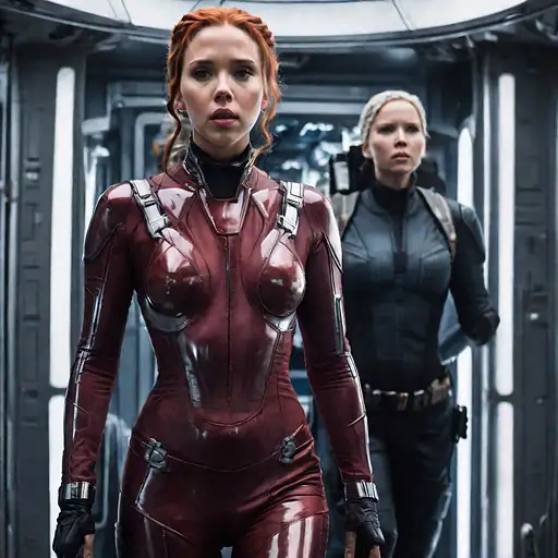 almost 2 years ago highest quality action photo, (scarlett johansson:jennifer lawrence:0. 4), transparent pvc catsuit, skin-tight, legs apart, red, spaceship nostromo allbad 0 35