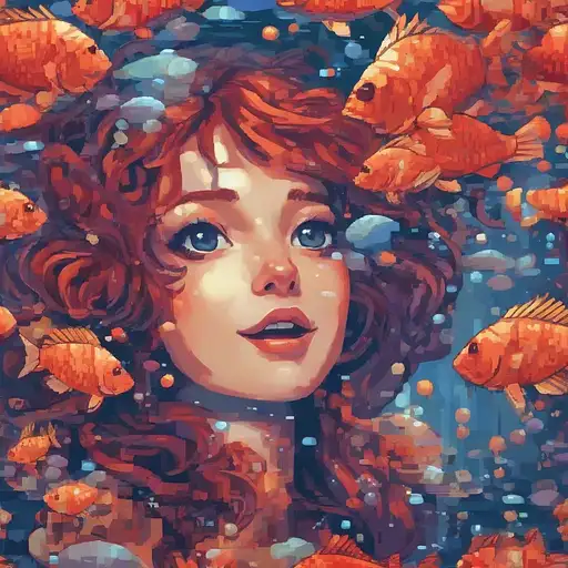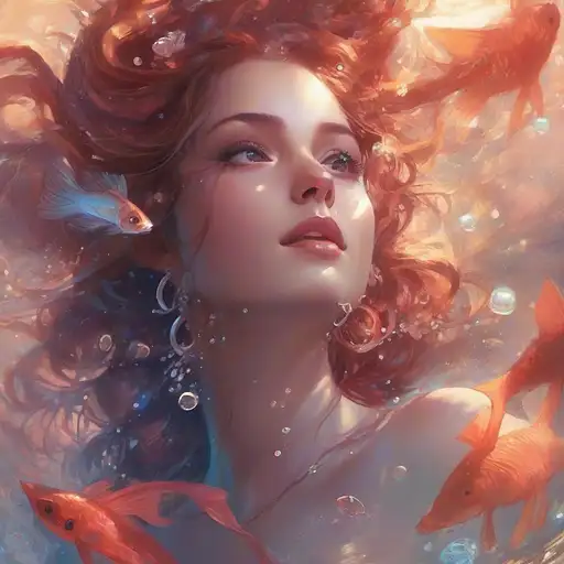 almost 2 years ago dark underwater, beautiful girl looking into camera, floating dark red hair, big blue eyes, smiling, tiny bubbles from mouth, bright shafts of sunlight striking down into water, coral, fish allbad 1 160