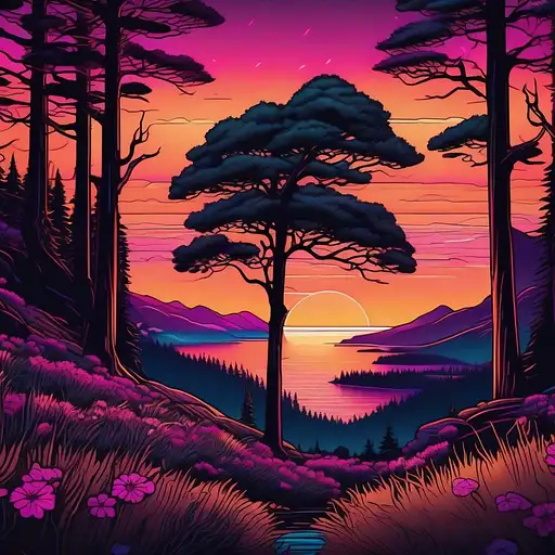 almost 2 years ago cartoon of scottish national park with a painting made of carved wood, bathing in rich light, deep colours, elegant nature at sunset theme, crisp, flawless, UHD, printing optimized, delicate, swaying, flowers, robust trees, tiny, intricate details, striking, balanced, perfect composition, pristine, high resolution quality, high detailed allbad 5 260