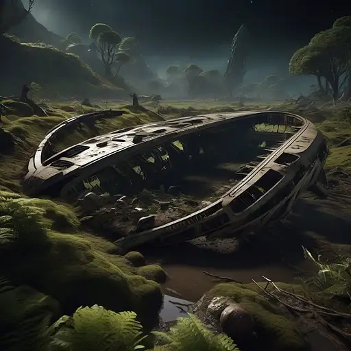 almost 2 years ago highly detailed wreckage of mile-long ancient [horseshoe:spaceship:0.8] crash landed on alien planet a long time ago, hull ripped apart, partly embedded in ground, tiny alien humanoidcreatures in mid foreground, mossy strands, rotting vegetation, marshy ground, reflections, gritty, dirty lighting, dark, moody, misty, cold, UHD allbad 5 260