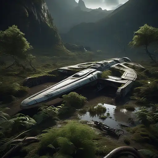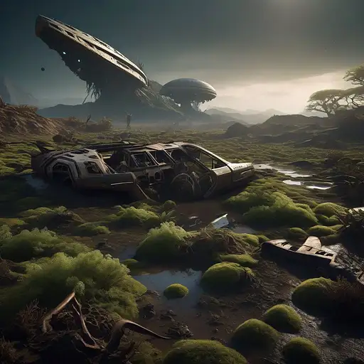 almost 2 years ago highly detailed wreckage of mile-long ancient [horseshoe:spaceship:0.2] crash landed on alien planet a long time ago, hull ripped apart, partly embedded in ground, tiny alien humanoidcreatures in mid foreground, mossy strands, rotting vegetation, marshy ground, reflections, gritty, dirty lighting, dark, moody, misty, cold, UHD allbad 0 71