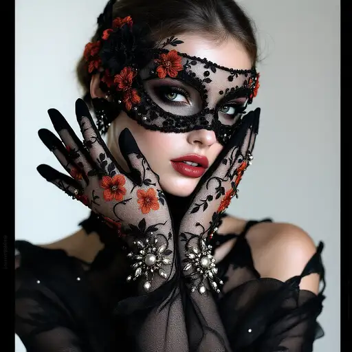 5 months ago A fashion photograph featuring a model wearing gloves with red persian rugg pattern black flowers, a mask covering the face, and gloves made from sheer fabric and rhinestones, all set against a white background. The model is posing in a studio, and the image was captured using an analog film camera. --ar 4:5 --v 6.1 arsham 0 37