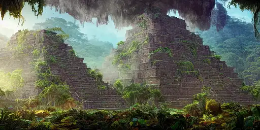 3 years ago fantasy painting of aztec ruins in a vast jungle, intricate abstract. delicate artwork. by tooth wu, wlop, beeple, dan mumford. octane render, trending on artstation, greg rutkowski very coherent symmetrical artwork. cinematic, hyper realism, high detail, octane render, 8 k, depth of field, bokeh. chrome accents. Stable Diffusion 1 86