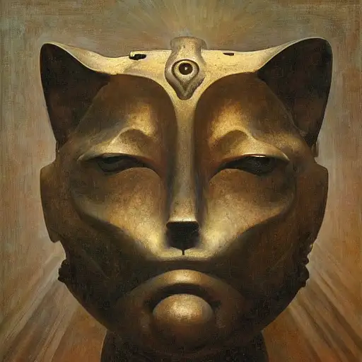 3 years ago masterpiece painting of an ancient bronze sculpture of a mechanical cat head, by annie swynnerton and diego rivera and nicholas roerich and jean delville and charlie bowater, symbolist, dramatic lighting, god rays, elaborate geometric ornament, art brut, rich colors, smooth sharp focus, extremely detailed, adolf wolfli Stable Diffusion 1 55