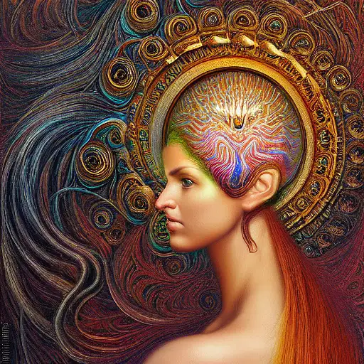 3 years ago perfectly centered portrait, front view of a beautiful biomechanical fractal mushroom goddess, female, flowing hair, intense stare, sweet smile, symmetrical, concept art, intricate detail, volumetric shadows and lighting, psychedelic colors, vibrant, realistic oil painting by gustave dore and alex grey, Stable Diffusion 1 86