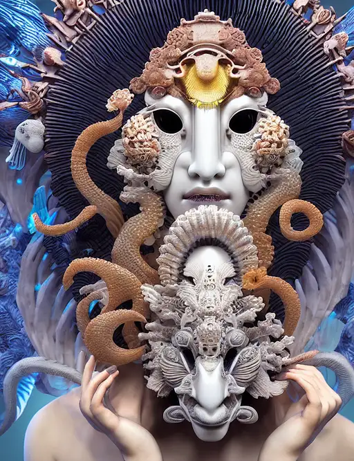 3 years ago 3 d goddess close - up profile portrait with ram skull. beautiful intricately detailed japanese crow kitsune mask and clasical japanese kimono. betta fish, jellyfish phoenix, bio luminescent, plasma, ice, water, wind, creature, artwork by tooth wu and wlop and beeple and greg rutkowski Stable Diffusion 1 72