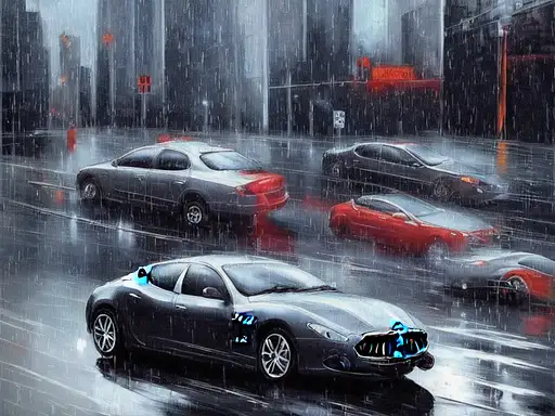 In this painting, a Maserati is depicted speeding through the rain. The sleek and powerful car creates a striking contrast against the dreary, rainy background. The car's shiny exterior reflects the wet pavement and the bright lights of the city, creating a dynamic and vibrant scene. The artist has skillfully captured the movement of the car, with the wheels spinning and water splashing in all directions. The raindrops blur the scene, adding a sense of movement and urgency to the painting. The use of warm and cool colors creates a sense of tension and excitement, with the warm tones of the car and its headlights contrasting with the cool blue and gray tones of the rainy night. Overall, this painting captures the energy and power of the Maserati as it speeds through the rain, creating a thrilling and visually stunning image., photorealistic, detailed, sharp focus, 8k, HDR, shallow depth of field, broad light, high contrast, backlighting, bloom, light sparkles, chromatic aberration, sharp focus, RAW color photo