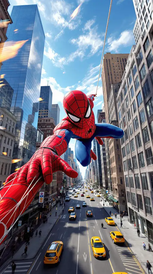 7 months ago "A clear first-person perspective of Spider-Man mid-swing above the bustling streets of New York City. The viewer sees the scene directly through Spider-Man’s eyes, with his right hand fully extended forward, gripping a web line that stretches toward a distant skyscraper. His left hand is visible in the lower part of the frame, fingers slightly curled, preparing to shoot another web. The motion is dynamic yet natural, with slight motion blur on the edges to emphasize speed, but the hands and suit remain sharp and detailed. Below, yellow taxis, moving cars, and scattered pedestrians fill the streets, creating a lively urban environment. Sunlight reflects off the towering glass buildings, casting realistic shadows. The sky is a bright blue with wispy clouds, and the entire perspective immerses the viewer into the exhilarating experience of swinging through the city as Spider-Man." b1c6f90bdbf 0 34