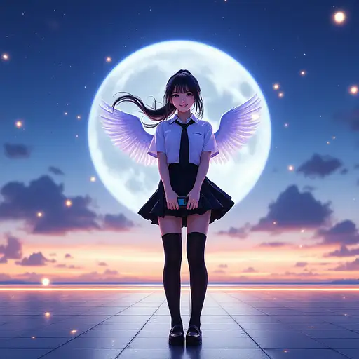 gamer girl that Nintendo Switch is smiling and wearing black stockings standing on a floor that is lit up, 1girl, solo, skirt, thighhighs, wings, long hair, necktie, black hair, shirt, pleated skirt, white shirt, looking at viewer, black thighhighs, short sleeves, school uniform, ponytail, sky, black skirt, , \beautiful composition, cinematic lighting, extremely detailed, 8k, cinematic postprocessing, {{bad fingers,bad-anatomy,missing-fingers}}, {{signature,watermark,username,artist name}}, {{retro style,poor-quality }}, Maximum Facial Detail, Maximum Detailed Texture, Maximum Detailed Shadow, Maximum Detailed Background,bioluminescence,,character focus, depth of field, glowing particles, glowing, reflection, blue theme, red theme, green theme, orange theme, yellow theme,highly detailed, ultra-sharp, 8K resolution,moonlight
