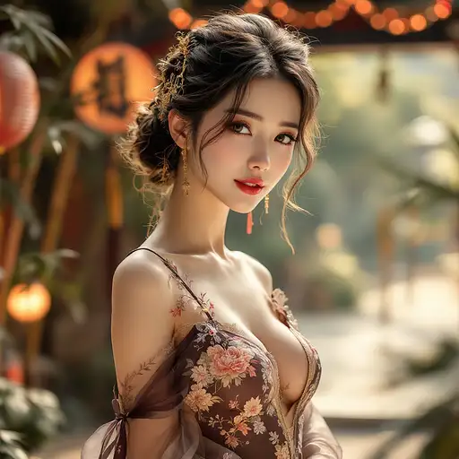 10 months ago A beautiful woman wearing a traditional Chinese dudou—a delicate, fitted undergarment—styled with a sensual yet elegant Chinese aesthetic. The dudou is made of luxurious silk in a rich color with intricate embroidery featuring floral and traditional Chinese patterns. The garment ties behind the neck and back, leaving the shoulders and arms bare, highlighting her graceful posture. Her hair is styled in a loose and romantic updo, adorned with golden hairpins and tassels. The background is a serene Chinese garden with a moon gate, lanterns softly glowing, and a hint of bamboo swaying, creating a warm and intimate atmosphere. The setting emphasizes both the traditional beauty and modern allure of the look. b34dc786d87 0 42
